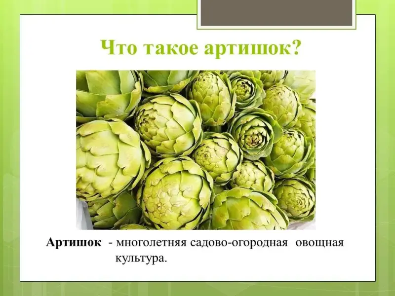 (2 слайд) Это многолетняя садово-огородная овощная культура, нераскрывшиеся бутоны растения («корзинки», «головки», «шишки») съедобны и относятся к деликатесным овощам. Отдалённо напоминают вкус молодого грецкого ореха.