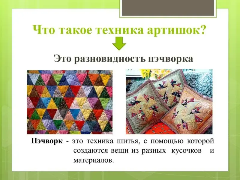 (3 слайд) Это разновидность пэчворк. Пэчворк или лоскутное шитье - это техника шитья, с помощью которой создаются вещи из разных кусочков и материалов.