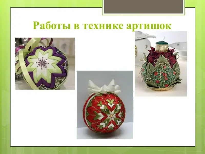 (6, 7 слайды) Работы в технике артишок создаются в основном из ткани и лент. Варианты работ вы можете увидеть на слайдах.