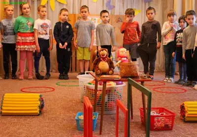 Дети идут по веревочкам с мешочком на голове, иногда останавливаются, садятся на корточки, проходят через препятствия (согласно тексту - как идет медведь).