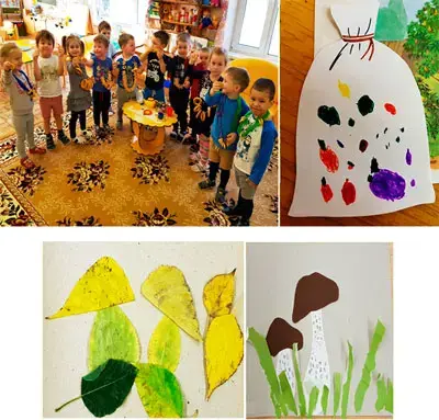В конце путешествия дети (по своему выбору): рисуют на блюде пирожки для дедушки и бабушки; лепят маленькие пирожки из пластилина, украшают их и придумывают, какая у них начинка; делают грибы и ягоды из разных материалов.