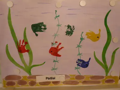 | 6) Вернувшись к детской работе, сравнить по цвету рыбки - игрушки и рыбки - отпечатки, обозначая их табличкой - рыба. Повесить детскую работу на стену и назвать - "рыбы" (повесить табличку под работой). | рыбы(т) |