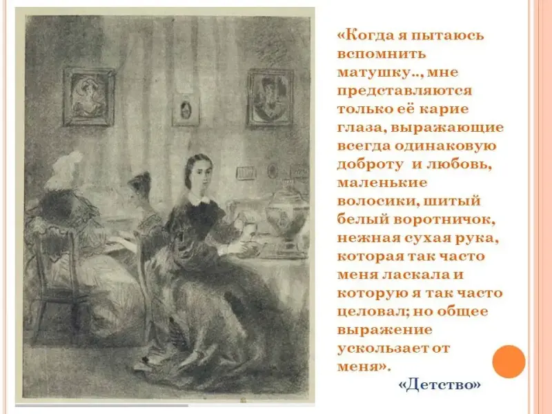 - Найдите строки повести, описывающие внешность maman. («Когда я стараюсь вспомнить матушку такою, какою она была в это время, мне представляются только её карие глаза выражающие всегда одинаковую доброту и любовь, родинка на шее, немного ниже того места, где вьются маленькие волосики, шитый белый воротничок, нежная сухая рука, которая так часто меня ласкала и которую я так часто целовал; но общее выражение ускользает от меня».) (с. 151)