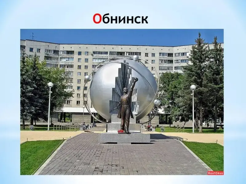 (Слайд 5) Этот памятник мирному атому находится в наукограде! Не далеко от Москвы. Там была построена первая в мире атомная электростанция. Этот город называется? Обнинск! (Слайд 6) Какой первый звук в названии города? Давайте скажем его вместе. И вспомним букву, которая обозначает этот звук! Напишем ее в воздухе средним пальцем правой руки!