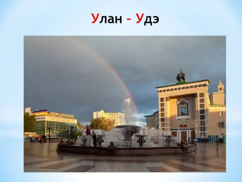 (Слайд 7) Этот город находится в Сибири! Суровой, далекой, но очень красивой части нашей страны. Столица республики Бурятия! Этот город называется? Улан - Удэ! В переводе с бурятского «красная река». (Слайд 8) Какой первый звук в названии города? Давайте скажем его вместе. И вспомним букву, которая обозначает этот звук! Напишем ее в воздухе безымянным пальцем правой руки!