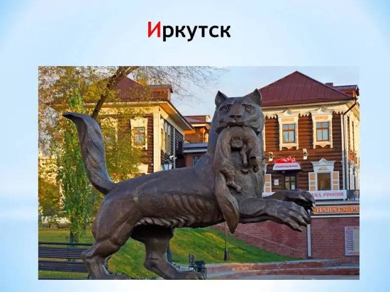 (Слайд 9) Это Бабр! Он является символом еще одного города в Сибири. Не далеко от этого города находится самое глубокое пресноводное озеро Байкал! Иркутск! (Слайд 10) Какой первый звук в названии города? Давайте скажем его вместе. И вспомним букву, которая обозначает этот звук! Напишем ее в воздухе мизинцем правой руки!