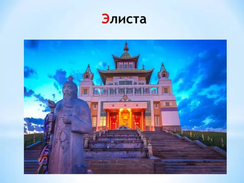 (Слайд 11) Этот город находится на Юге! В далекой республике Калмыкия и в переводе на русский язык означает «песчаный»! Этот город называется? Элиста! (Слайд 12) Какой первый звук в названии города? Давайте скажем его вместе. И вспомним букву, которая обозначает этот звук! Напишем ее в воздухе большим пальцем правой руки!