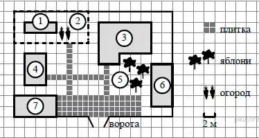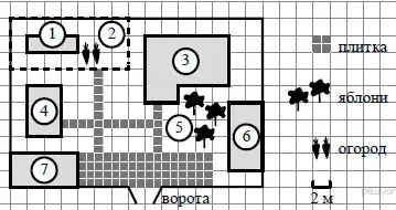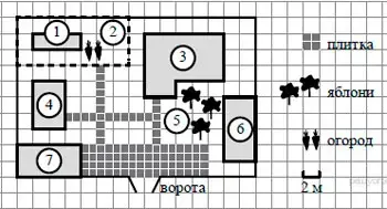 При входе на участок справа от ворот находится баня, а слева - гараж, отмеченный на плане цифрой 7. Площадь, занятая гаражом, равна 32 кв. м.