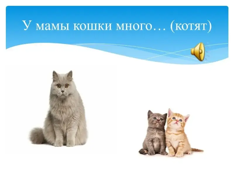Перед тобой картинка. На картинке изображена мама кошка и котята. Давай составим предложение. Послушай, что у нас получилось: «У мамы кошки много котят».