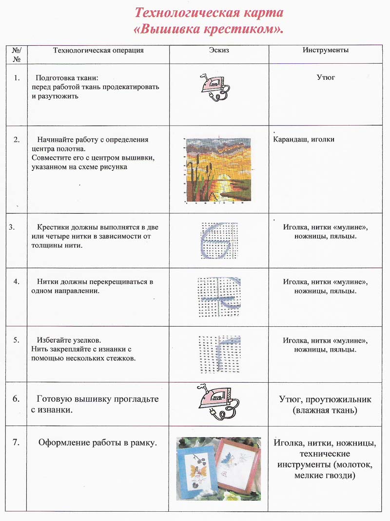 Материалы и оборудование: КП, принтер, сканер, тесты, обучающие программы, технологические карты. Лучшие работы учащихся старших классов как образцы рукоделия.