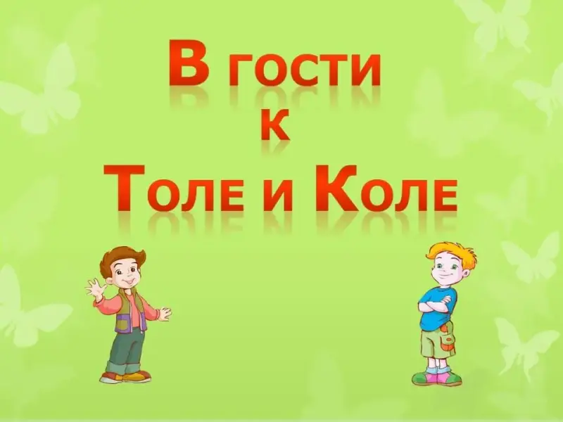 [слайд 1]. Сегодня мы отправимся в гости к двум друзьям Толе и Коле. Это очень хорошие ребята. Они дружат и никогда не сорятся.