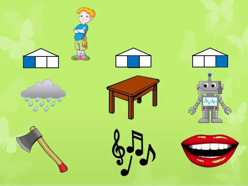 [слайд 7]. И Толя приготовил нам 3 домика. В первом будут жить картинки со звуком «Т» в начале слова. Во втором - в середине. В третьем - в конце. Вспомните какие у нас были картинки. Теперь подумаем, а какие мы поселим в первый домик? Назовите. Какие во второй? Какие в третий?