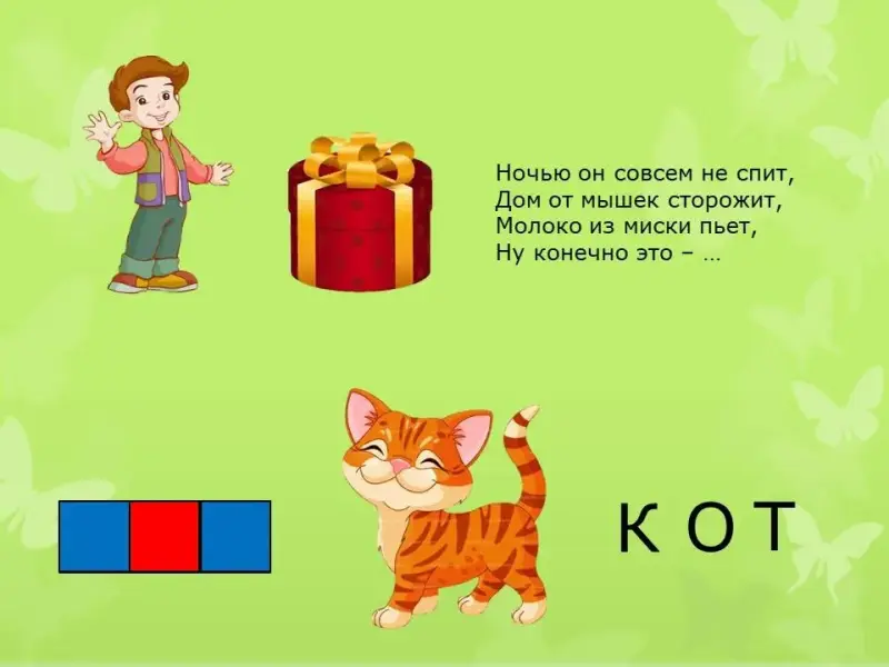 [слайд 10]. Отгадали, молодцы! А скажите какой первый звук в слове «кот»? Какой второй? Какой третий? Мы с вами составили звуковую схему слова «КОТ»!