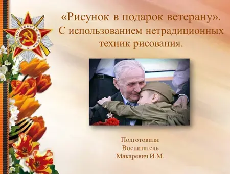Макаревич Ирина Михайловна 18.06.2020 Работа с дошкольниками Рисунок в подарок ветерану Работа выполнена в форме презентации. Приложения pril.pptx (2.21 МБ) поделиться ВКонтакте Одноклассники Телеграм Копировать ссылку #9 мая #Ветераны войны #Ветераны #Поздравление #Ри Похожие уроки