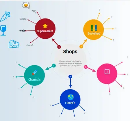 Один из способов, который позволяет запомнить и применить новую информацию - это ее структурирование. Если хорошо понимать цель, для которой что-то изучается, то это сделать намного проще и диапазон изученных словарных единиц становится шире. Таким образом, при изучении некоторых разделов курса, можно применять технологию Mind Maps. Например, изучая тему "Shopping" ученикам 5 класса было предложено рассказать о различных типах магазинов и товарах, которые там можно приобрести. Каждый ученик создал собственную карту и поместил туда свои слова и выражения. Однако, допустимо и совместное создание интерактивных лексических карт, например, используя режим дистанционного управления в приложении Zoom и ресурсы сайта vangage.com по созданию виртуальных карт. В зависимости от особенностей схемы, можно использовать один из имеющихся шаблонов, а также изменять его параметры.