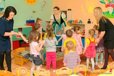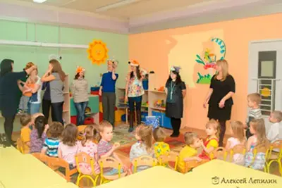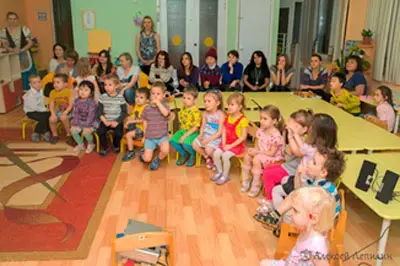 Дети сидят полукругом на стульчиках на ковре, родители-зрители - напротив, на скамейках. Между ними, в середине группы, разворачивается все действие.