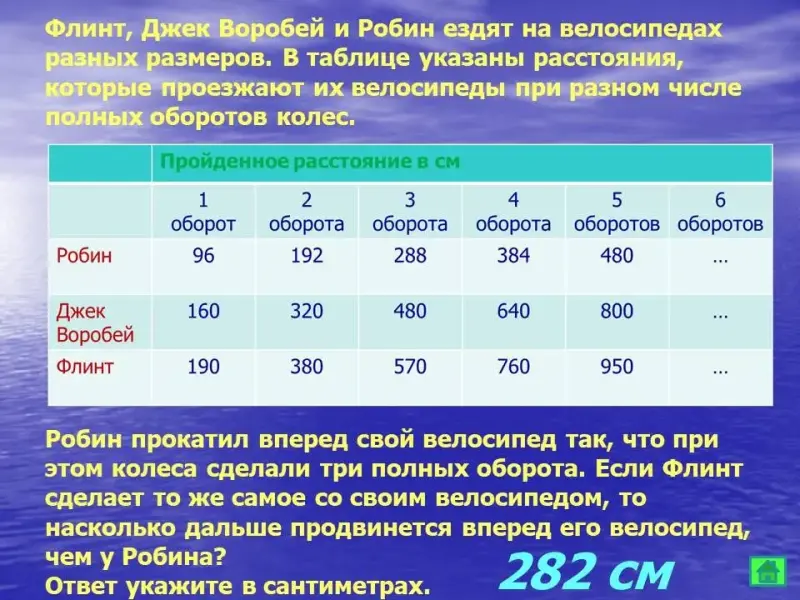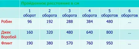- Флинт, Джек Воробей и Робин ездят на велосипедах разных размеров. В таблице указаны расстояния, которые проезжают их велосипеды при разном числе полных оборотов колес.