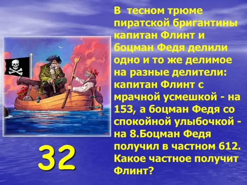 Задача: В тесном трюме пиратской бригантины капитан Флинт и боцман Федя делили одно и то же делимое на разные делители: капитан Флинт с мрачной усмешкой - на 153, а боцман Федя со спокойной улыбочкой - на 8.Боцман Федя получил в частном 612. Какое частное получит Флинт? (32)