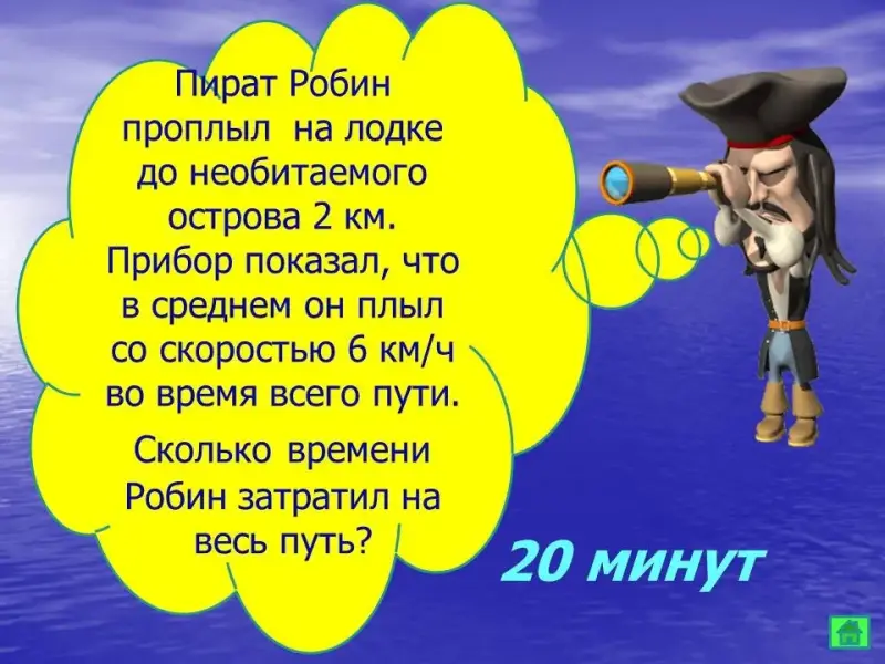 - Пират Робин проплыл на лодке до необитаемого острова 2 км. Прибор показал, что в среднем он плыл со скоростью 6 км/ч во время всего пути. Сколько времени Робин затратил на весь путь? (20 мин)