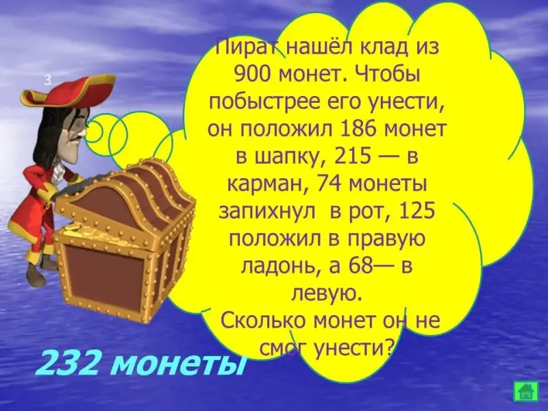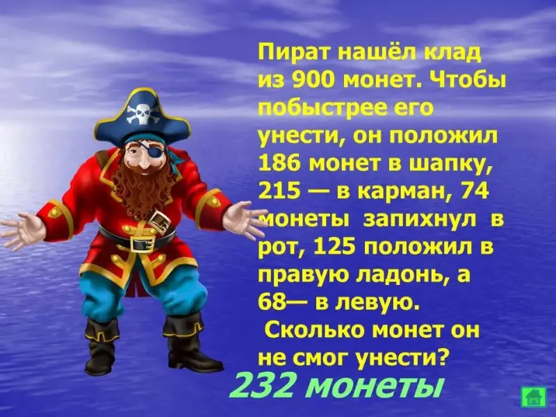 - Пират нашёл клад из 900 монет. Чтобы побыстрее его унести, он положил 186 монет в шапку, 215 - в карман, 74 монеты запихнул в рот, 125 положил в правую ладонь, а 68- в левую. Сколько монет он не смог унести? (232 монеты)
