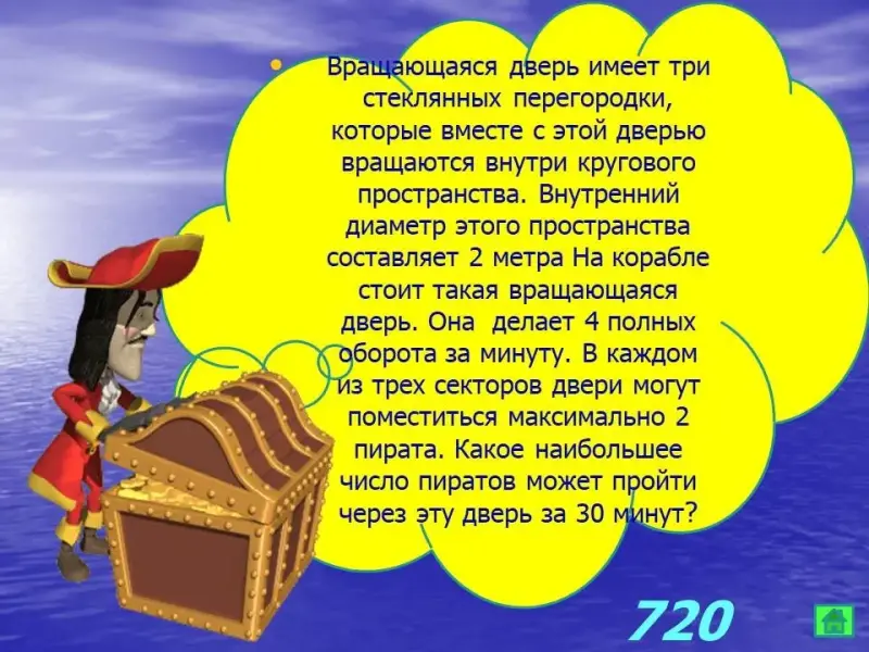 - Вращающаяся дверь имеет три стеклянных перегородки, которые вместе с этой дверью вращаются внутри кругового пространства. Внутренний диаметр этого пространства составляет 2 метра. На корабле стоит такая вращающаяся дверь. Она делает 4 полных оборота за минуту. В каждом из трех секторов двери могут поместиться максимально 2 пирата. Какое наибольшее число пиратов может пройти через эту дверь за 30 минут? (720)