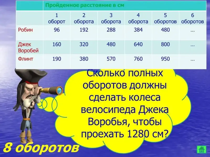 - Сколько полных оборотов должны сделать колеса велосипеда Джека Воробья, чтобы проехать 1280 см? (8)