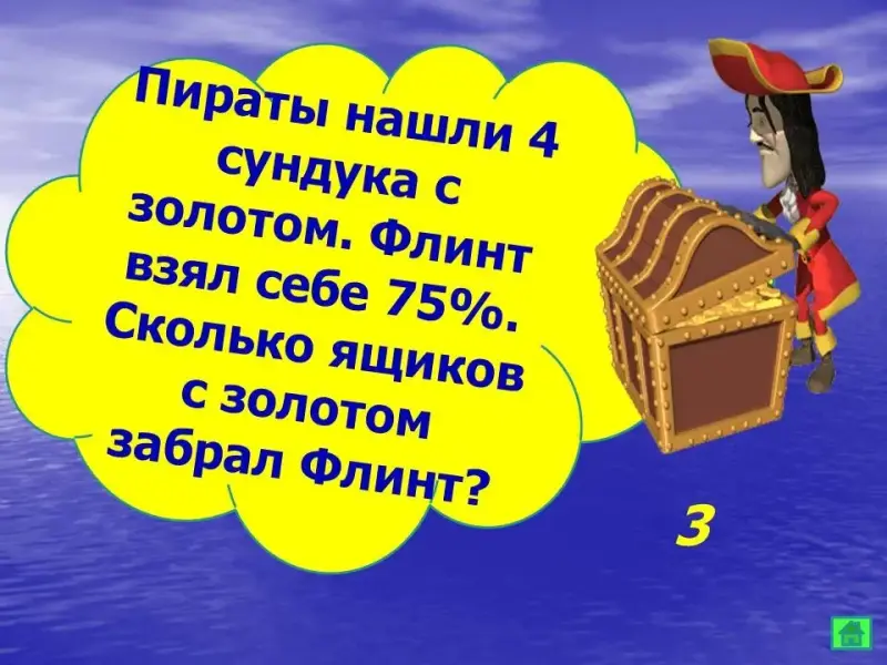 - Пираты нашли 4 сундука с золотом. Флинт взял себе 75%. Сколько ящиков с золотом забрал Флинт? (3)