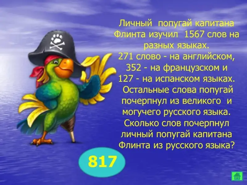 - Личный попугай капитана Флинта изучил 1567 слов на разных языках. 271 слово - на английском, 352 - на французском и 127 - на испанском языках. Остальные слова попугай почерпнул из великого и могучего русского языка. Сколько слов почерпнул личный попугай капитана Флинта из русского языка? (817)