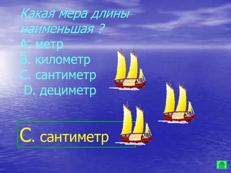- Какая мера длины наименьшая: метр, километр, сантиметр, дециметр? (сантиметр)