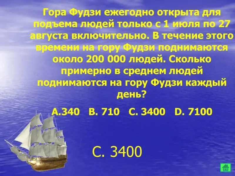- Гора Фудзи ежегодно открыта для подъема людей только с 1 июля по 27 августа включительно. В течение этого времени на гору Фудзи поднимаются около 200 000 людей. Сколько примерно в среднем людей поднимаются на гору Фудзи каждый день? А. 340 B. 710 C. 3400 D. 7100 (С.3400)Решите уравнение: х - 25 = 1205 (1230)