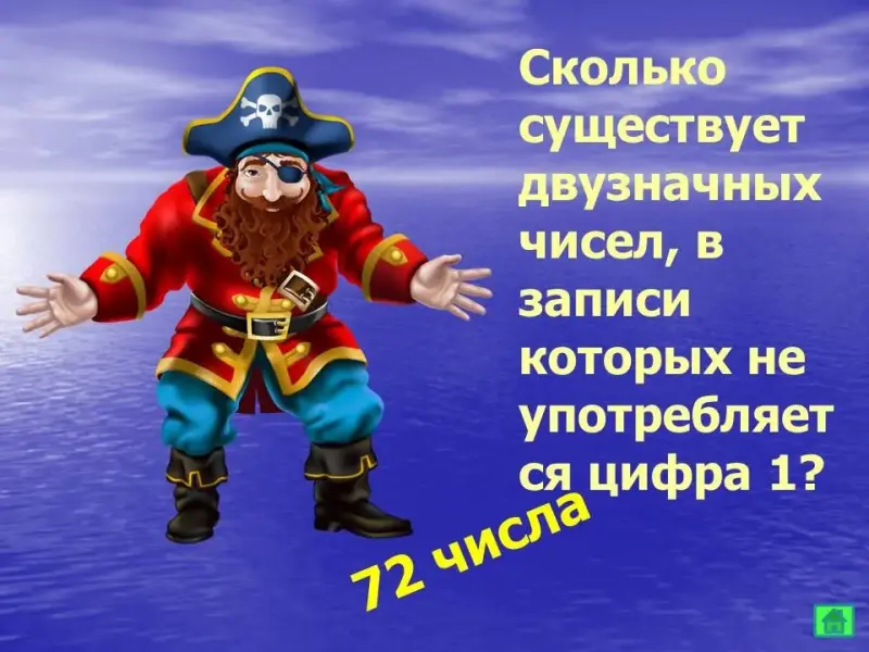 - Сколько существует натуральных чисел, в записи которых не употребляется цифра 1? (72)