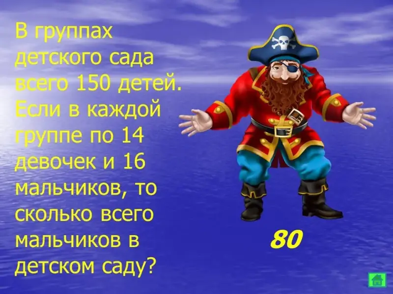 - В группах детского сада всего 150 детей. Если в каждой группе по 14 девочек и 16 мальчиков, то сколько всего мальчиков в детском саду? (80)