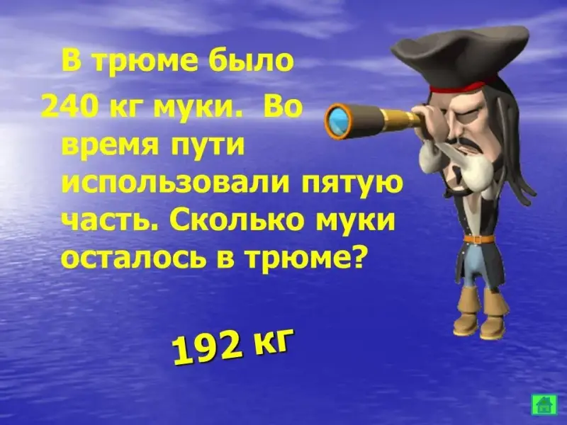 - В трюме было 240 кг муки. Во время пути использовали пятую часть. Сколько муки осталось в трюме? (192)