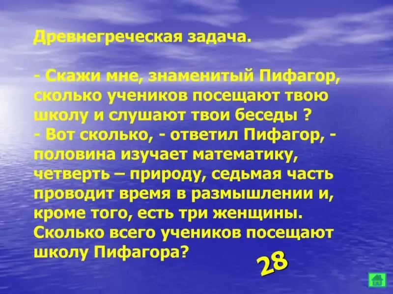 - Вот сколько, - ответил Пифагор, - половина изучает математику, четверть - природу, седьмая часть проводит время в размышлении и, кроме того, есть три женщины.