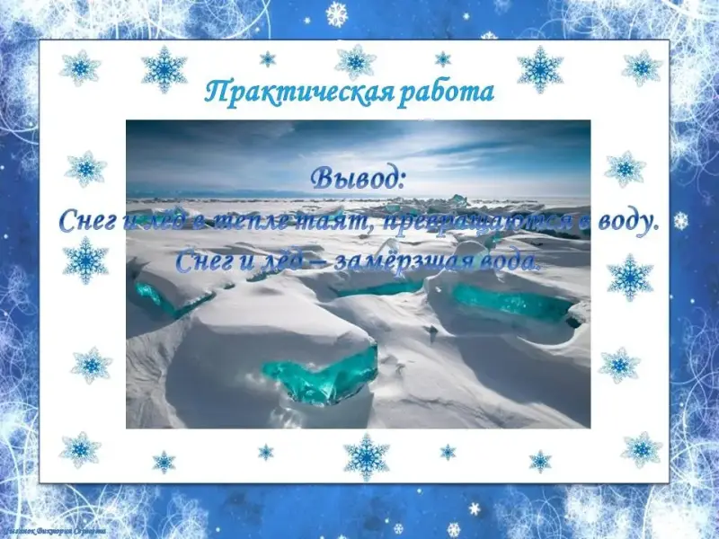 Вывод: Снег и лёд в тепле таят, превращаются в воду. Снег и лёд - замёрзшая вода.