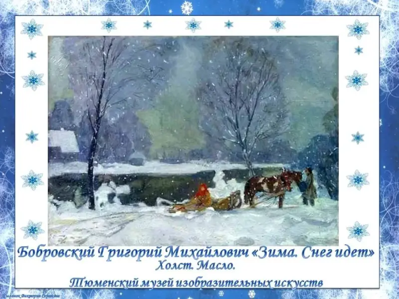 - Рассмотрите картину художника Бобровского Григория Михайловича «Зима. Снег идет».