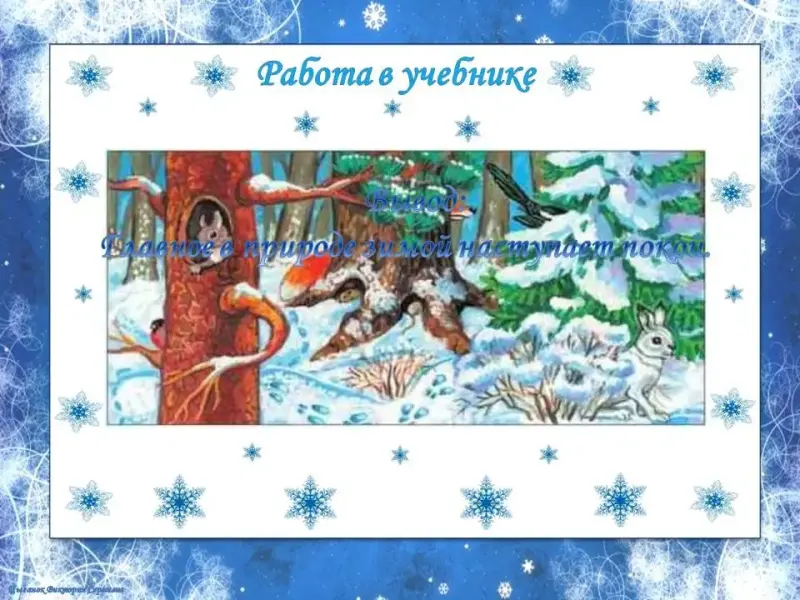Вывод: Мы назвали много изменений, которые происходят в природе зимой. А главное в природе наступает покой.