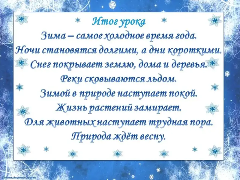 Вывод: Зима - самое холодное время года. Ночи становятся долгими, а дни короткими. Снег покрывает землю, дома и деревья. Реки сковываются льдом.