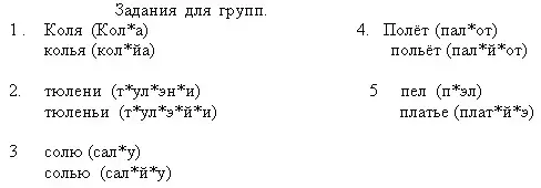 Олен...и, друз....я, п...юре, пол...ю, пал...то, стул...я, пол...ю, в...юга, мурав....и, свин...я,пал...ма, олен...и.)