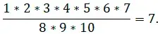 Задача 3. Натуральные числа от 1 до 10 разбили на две группы так, что произведение чисел в первой группе делится на произведение чисел во второй группе. Какое наименьшее значение может принимать частное от деления первого произведения на второе?