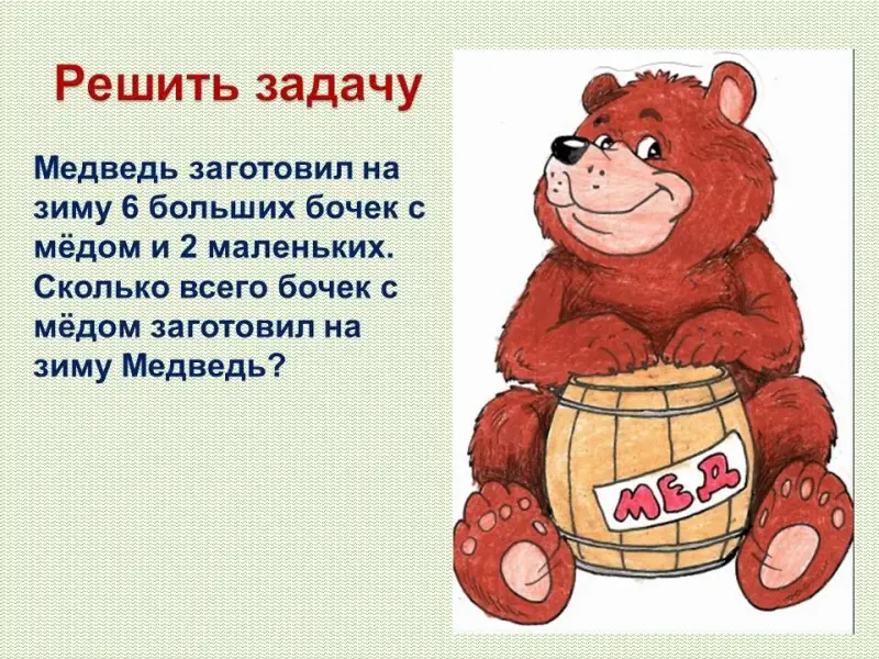 Медведь заготовил на зиму 6 больших бочек с мёдом и 2 маленьких. Сколько всего бочек с мёдом заготовил на зиму Медведь?