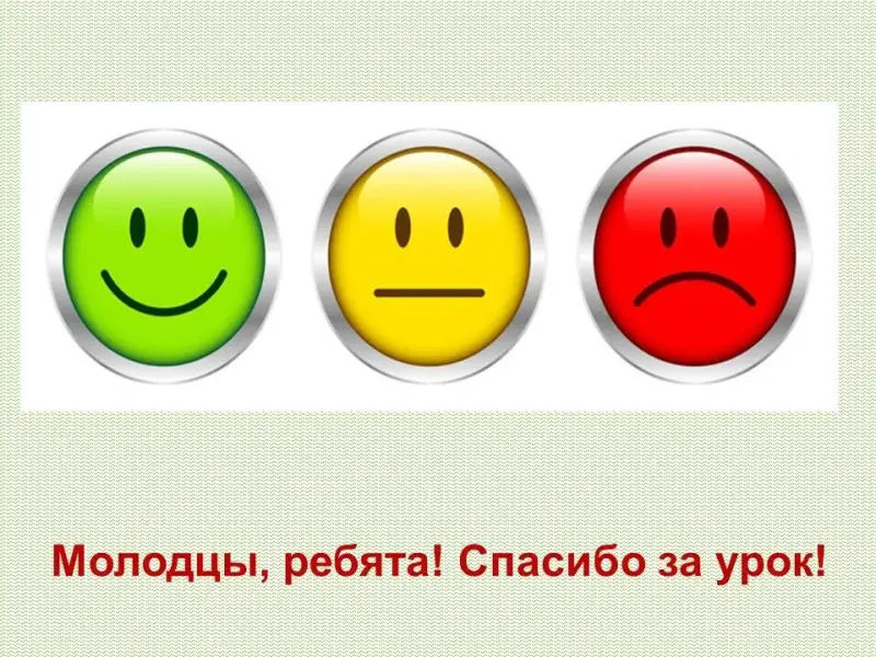 - Если вы довольны своей работой на уроке, но можете работать активнее, нарисуйте жёлтый смайлик. - Если вы ничего не поняли на уроке, и вам понадобится помощь учителя, чтобы он опять объяснил тему урока, нарисуйте красный смайлик. Герои сказки Теремок благодарят вас за помощь и угощают вас конфетами.