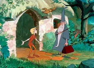 3. Nobody understood why Wart needed lessons, but Merlin began to teach him. One day Merlin led Wart to a lake, waved his wand and Wart changed into a little fish, and fell into the water. At first it was great fun. But then a big fish came along. The big fish wanted to catch the little fish for lunch. Poor little Wart! What could he do? He used his head. He hid in a hole so the big fish couldn't find him. "Very good," said Merlin. "You learned your lesson, Wart. "WHEN IN TROUBLE USE YOUR HEAD."