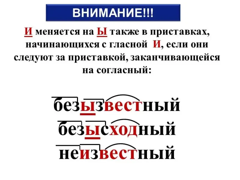 - Теперь нужно разобраться, после каких именно приставок буква И переходит в букву Ы, а в каких нет. (И меняется на Ы после приставок на согласный).