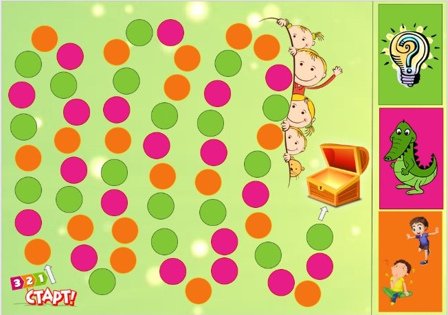 Игроки по очереди бросают кубик, передвигаются на столько клеточек, сколько очков выпало. Игрок попадает на цветную клеточку, которая обозначает определенный блок заданий (например: зелёный - Ассоциации, розовый - Крокодилёнок, оранжевый - Правда или действие), берет карточку соответствующего цвета, выполняет написанное задание. Игрок, которому не удалось успешно выполнить задание, возвращается на исходную (предыдущую) позицию. Игрок, выполнивший задание, остается на текущей клеточке до следующего своего хода и получает карточку, на которой указано качество человека. Игроку необходимо положить данную карточку в один из сундучков (положительное/ отрицательное качество). Можно обсудить с участниками игры, что это за качество, в какой ситуации может проявиться, есть ли данное качество у игроков.