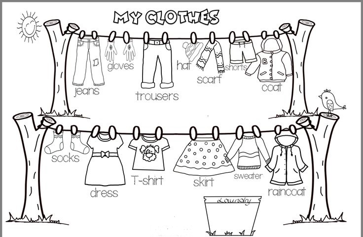 5. Аудирование. Учитель читает описание цвета одежды, учащиеся раскрашивают одежду, потом обводят названия одежды.