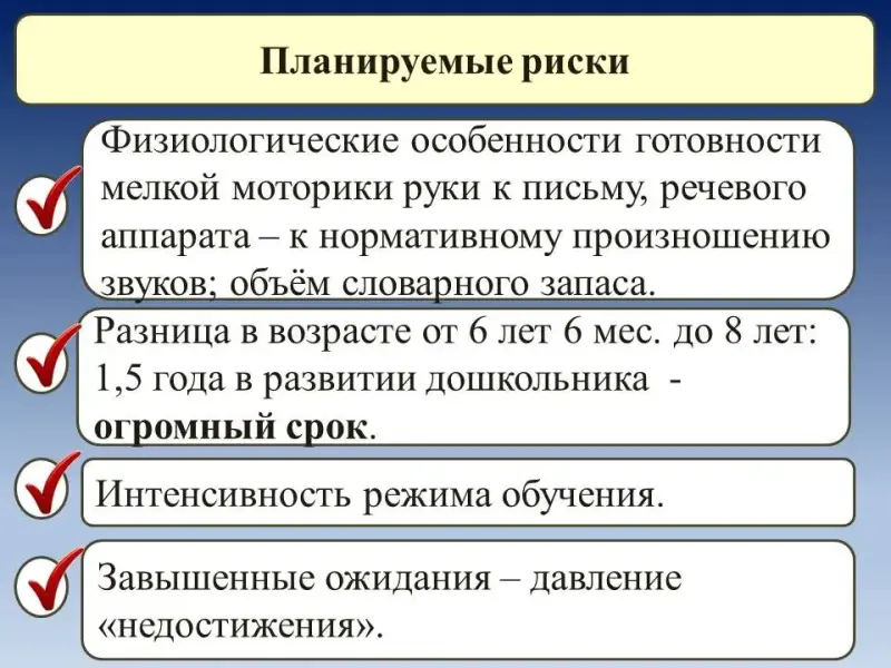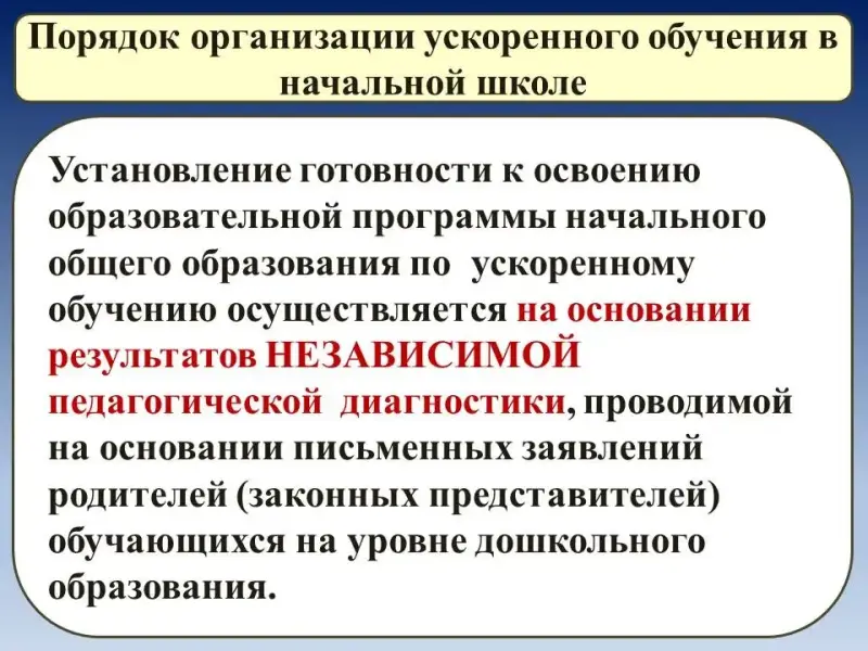 Важным является и психолого-физиологическая готовность ребенка к ускоренному обучению (обязательное достижение ребенком 7-летнего возраста на 1 сентября, основная группа здоровья, высокий уровень мотивационной готовности будущего первоклассника).