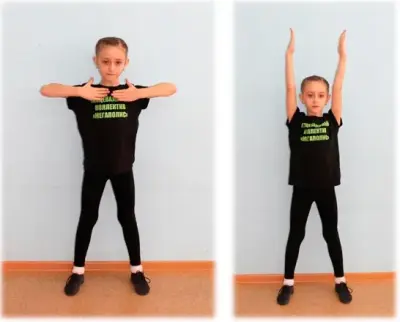 а) На счет 1, 2, 3, 4 - отводим вверх обе руки и собираем их к плечам, сгибая в локтевых суставах;