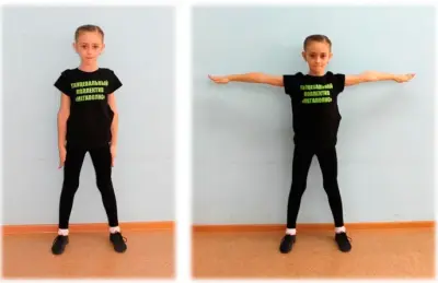 б) 1 - отводим в сторону правую руку, 2 - собираем ее к плечу, 3 - отводим в сторону левую руку, 4 - собираем ее к плечу;