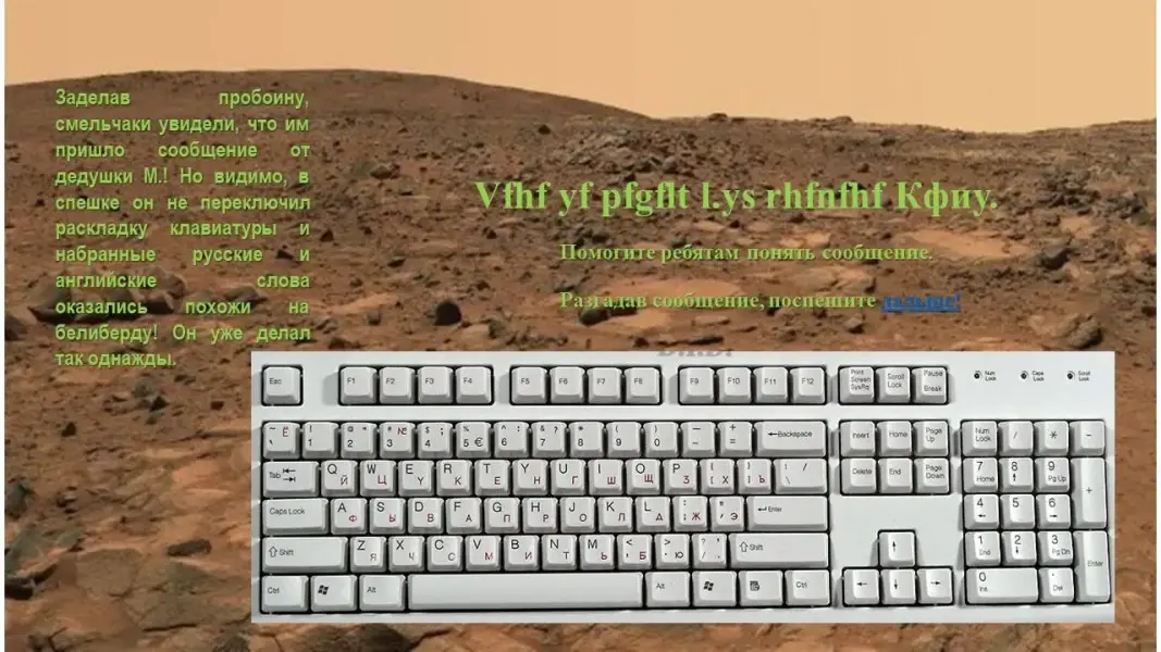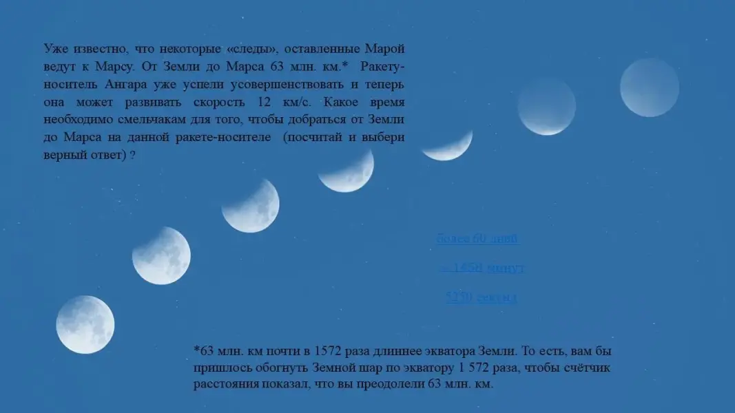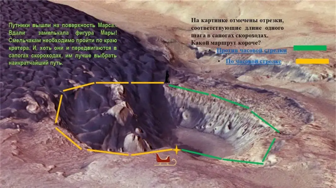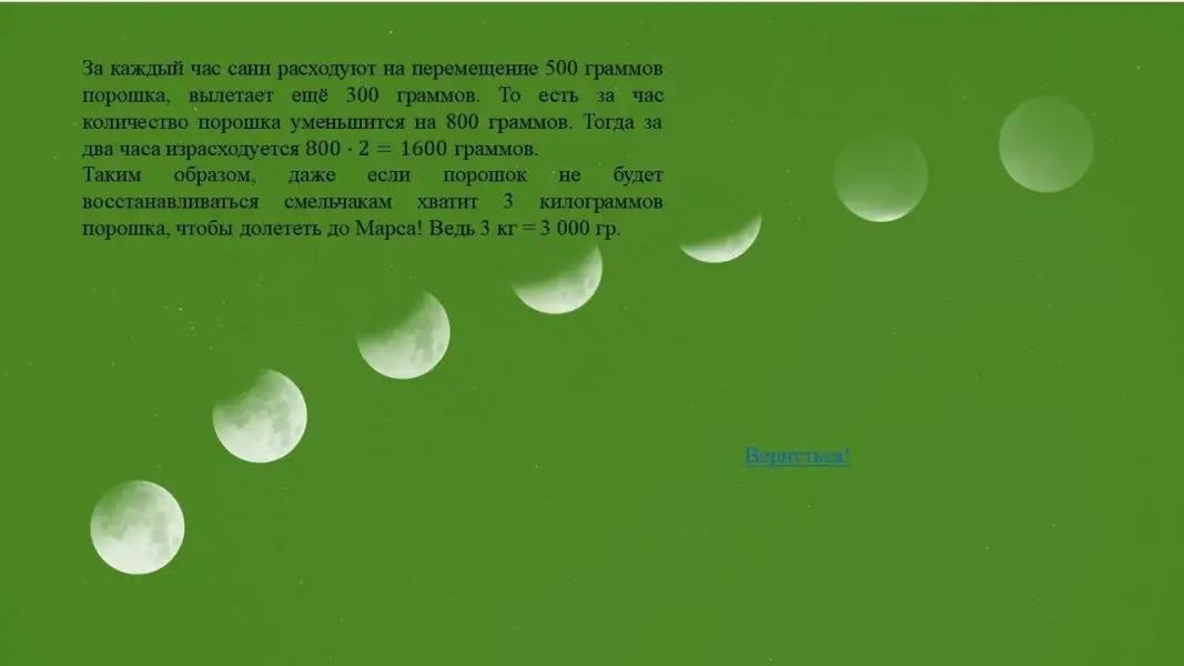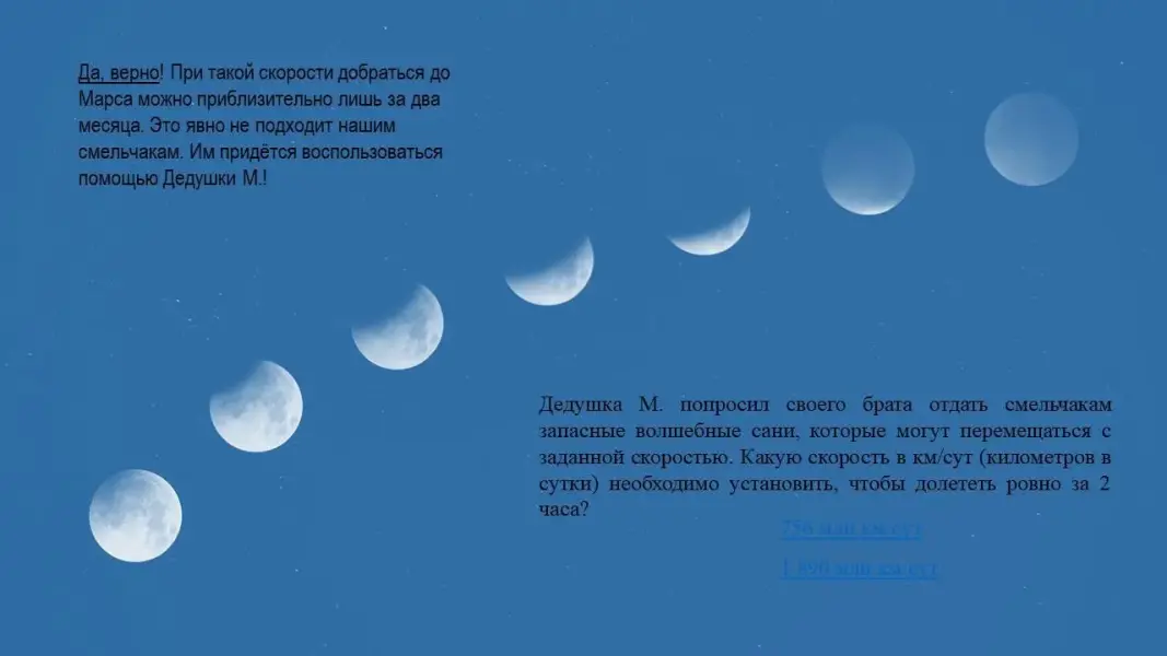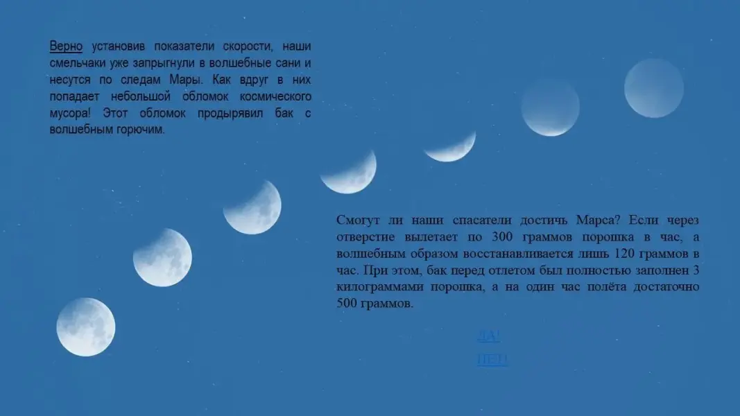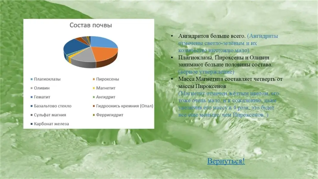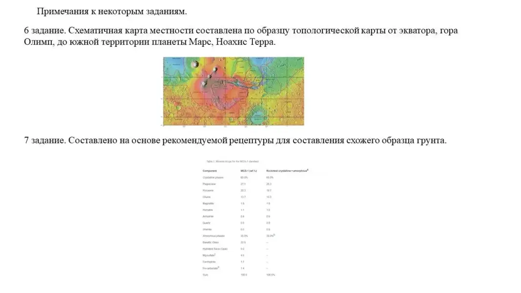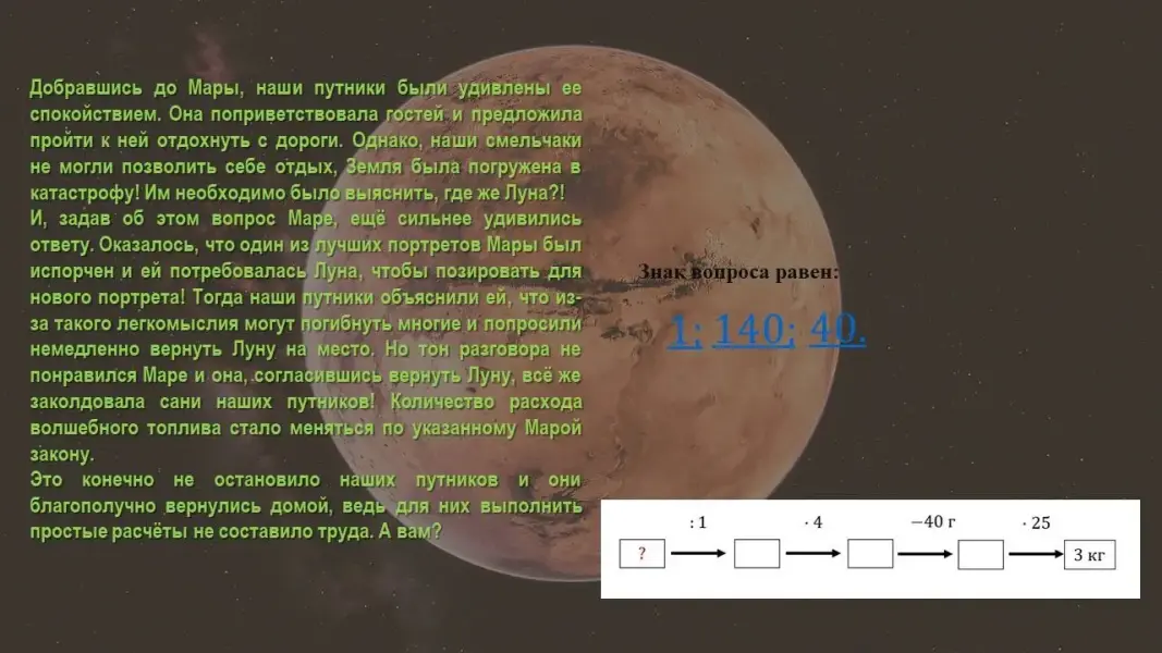 3. Сбор и уточнение информации. При составлении даже самых простых задач, не стоит пренебрегать их реалистичностью. Точно также, как мы просим своих учеников оценивать свои ответы (например, просим понимать, что в задаче не должен быть ответ в полтора землекопа), необходимо оценивать и данные при составлении своих задач. Придётся потратить не мало времени на поиск необходимой информации. Опишу лишь несколько примеров из своей сказки. Имя злой героини, Мара**, было выбрано после поиска отрицательных персонажей. Одной бабой Ягой современных ребят уже не напугаешь, приходится обращаться ко всему пантеону славянских Богинь. Что в свою очередь возбуждает у некоторых учащихся дополнительный интерес к данной теме. Другим ярким примером качественного подбора необходимой информации я бы назвала восьмое задание, в котором дана диаграмма образца почвы, схожего с марсианской почвой. Хотя, конечно к сожалению, сложность полученной информации довольна велика. Но при этом задание составлено так, чтобы избежать необходимости учащихся разбираться в качественном понимании используемых ингредиентов. Пытливые ученики, после пройденного путешествия и возвращения домой, подмечают разницу между почвой на Земле и почвой Марса, и задаются вопросом о причинах такого различия.